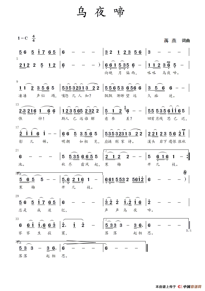 乌夜啼(蒋燕词 蒋燕曲)曲谱是由作词:蒋燕作曲:蒋燕,上传:燕子,版权归原作者所有。