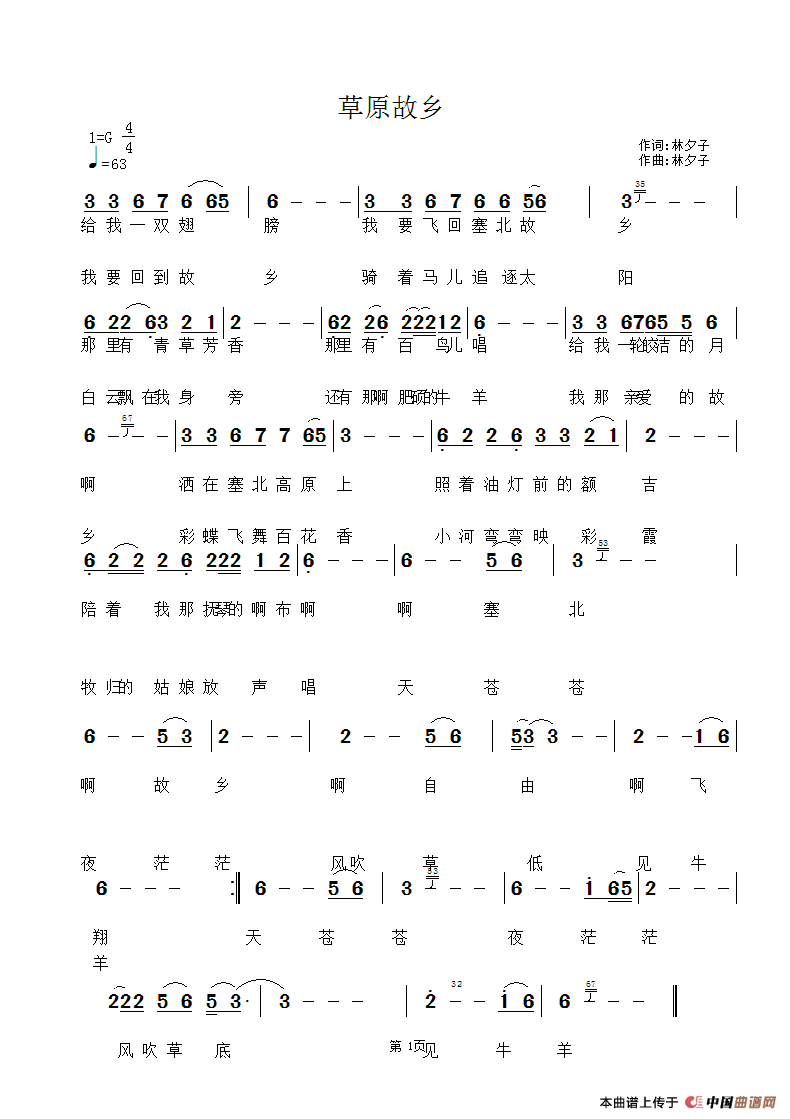 草原故乡(林夕子词 林夕子曲)曲谱是由作词:林夕子作曲:林夕子,上传:林夕子,版权归原作者所有。