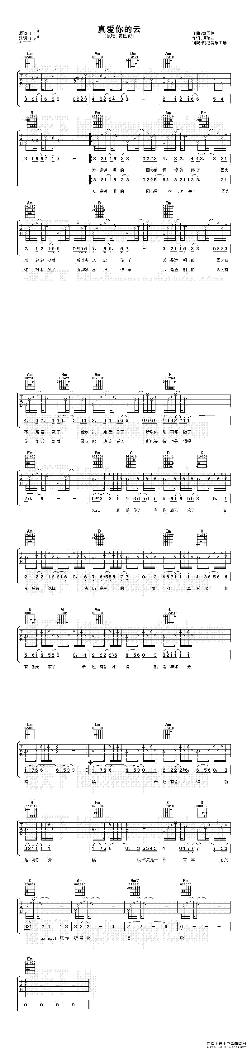 温馨提示:想要保存真爱你的云吉他谱六线谱,深情旋律动人曲谱?在曲谱图片上单击右键,选择"图片另存为...",即可将该曲谱保存到您的电脑本地,想要打印出来?将图片插入到WORD中,调整合适到大小打印即可。