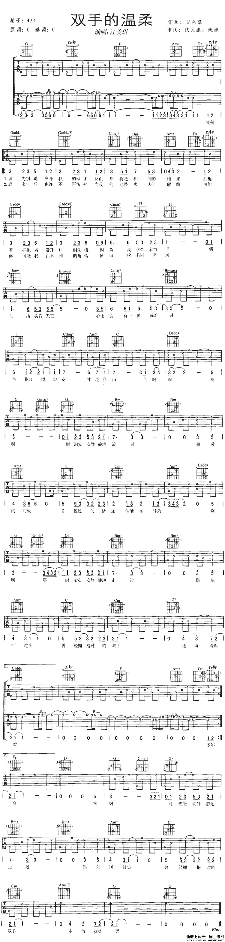温馨提示:想要保存双手的温柔吉他谱六线谱,传递细腻情感曲谱?在曲谱图片上单击右键,选择"图片另存为...",即可将该曲谱保存到您的电脑本地,想要打印出来?将图片插入到WORD中,调整合适到大小打印即可。