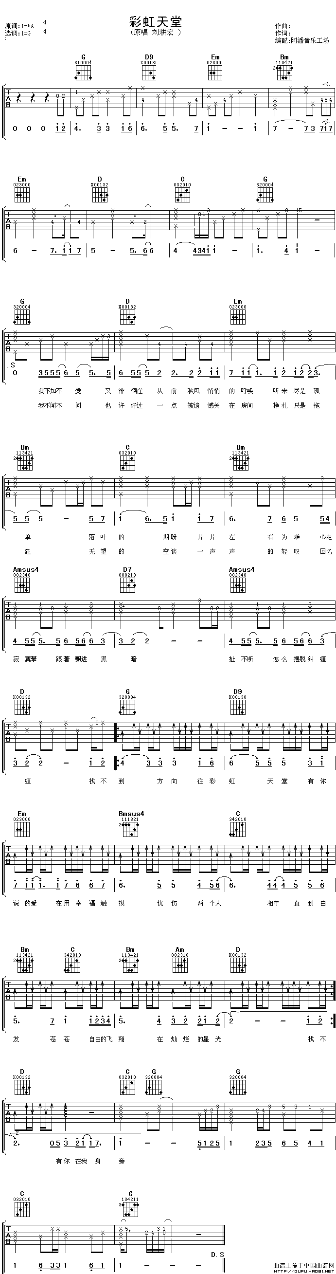 温馨提示:想要保存彩虹天堂吉他谱,温暖治愈之曲曲谱?在曲谱图片上单击右键,选择"图片另存为...",即可将该曲谱保存到您的电脑本地,想要打印出来?将图片插入到WORD中,调整合适到大小打印即可。