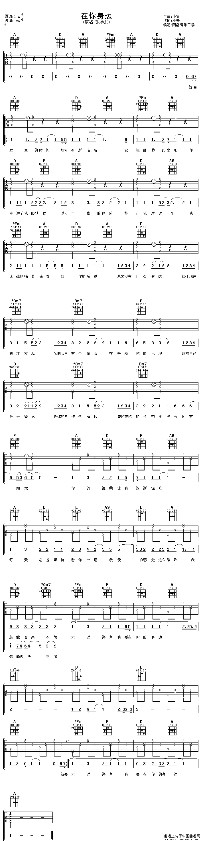 温馨提示:想要保存在你身边(小安词小安曲)吉他谱六线谱,温暖陪伴之歌曲谱?在曲谱图片上单击右键,选择"图片另存为...",即可将该曲谱保存到您的电脑本地,想要打印出来?将图片插入到WORD中,调整合适到大小打印即可。