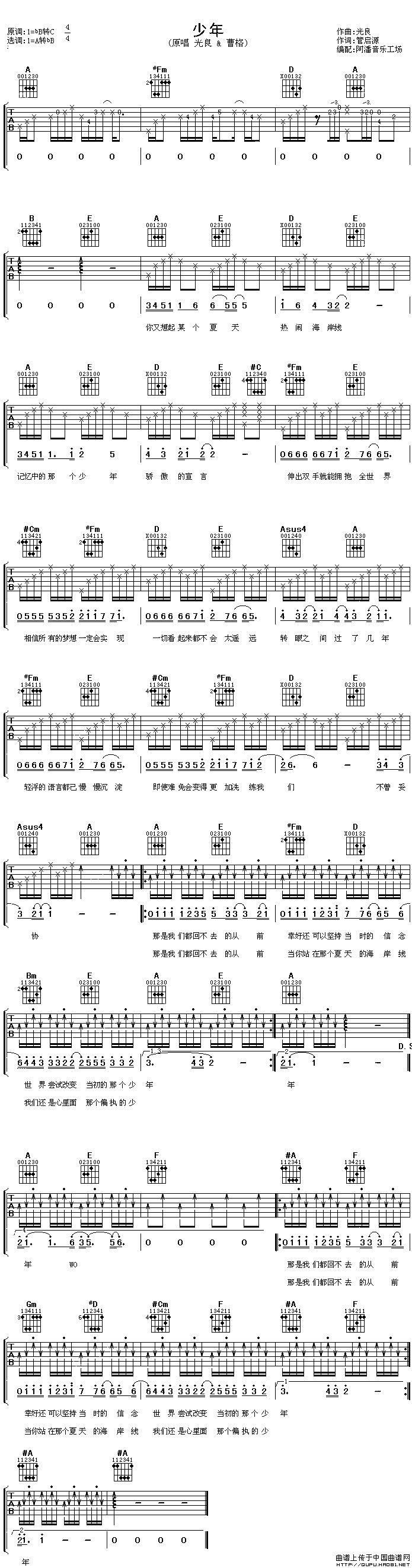 温馨提示:想要保存少年吉他谱,青春励志之音曲谱?在曲谱图片上单击右键,选择"图片另存为...",即可将该曲谱保存到您的电脑本地,想要打印出来?将图片插入到WORD中,调整合适到大小打印即可。