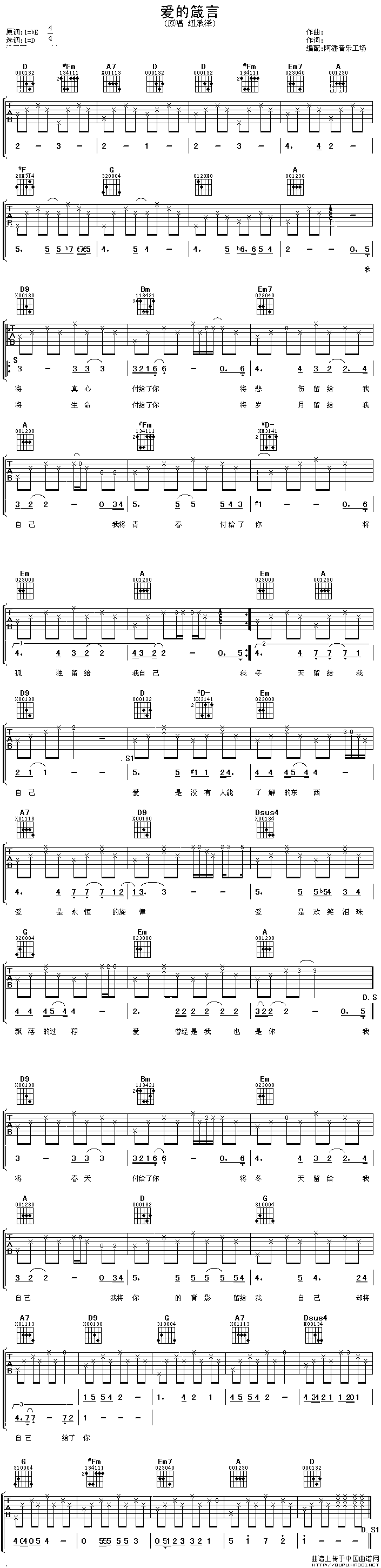 温馨提示:想要保存爱的箴言吉他谱六线谱,深情爱意之佳作曲谱?在曲谱图片上单击右键,选择"图片另存为...",即可将该曲谱保存到您的电脑本地,想要打印出来?将图片插入到WORD中,调整合适到大小打印即可。