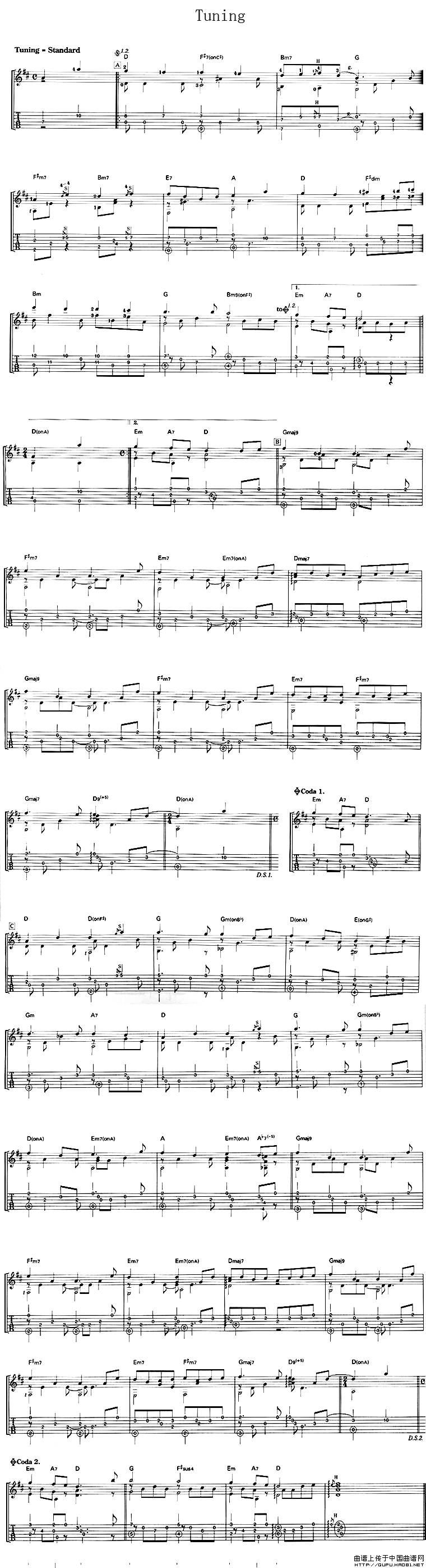 温馨提示:想要保存Tuning吉他谱六线谱,旋律灵动悦耳曲谱?在曲谱图片上单击右键,选择"图片另存为...",即可将该曲谱保存到您的电脑本地,想要打印出来?将图片插入到WORD中,调整合适到大小打印即可。