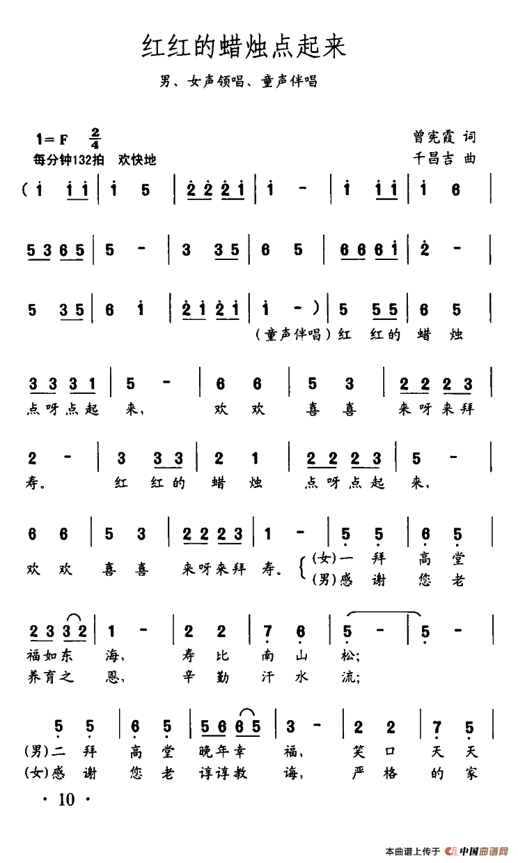 红红的蜡烛点起来曲谱是由作词:曾宪霞作曲:千昌吉演唱(奏):寻枫王洪志领唱童声合唱,上传:editor2,版权归原作者所有。