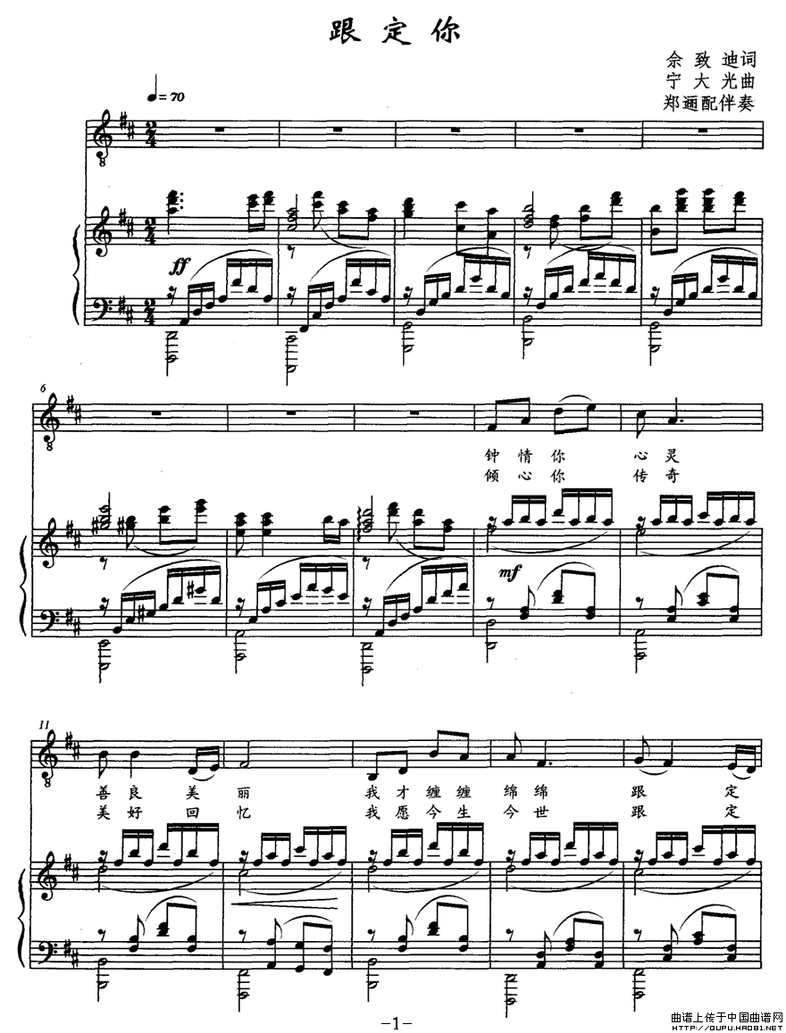 跟定你(佘致迪词 宁大光曲、正谱)曲谱是由作词:佘致迪作曲:宁大光格式:五线谱,上传:秋叶起舞,版权归原作者所有。