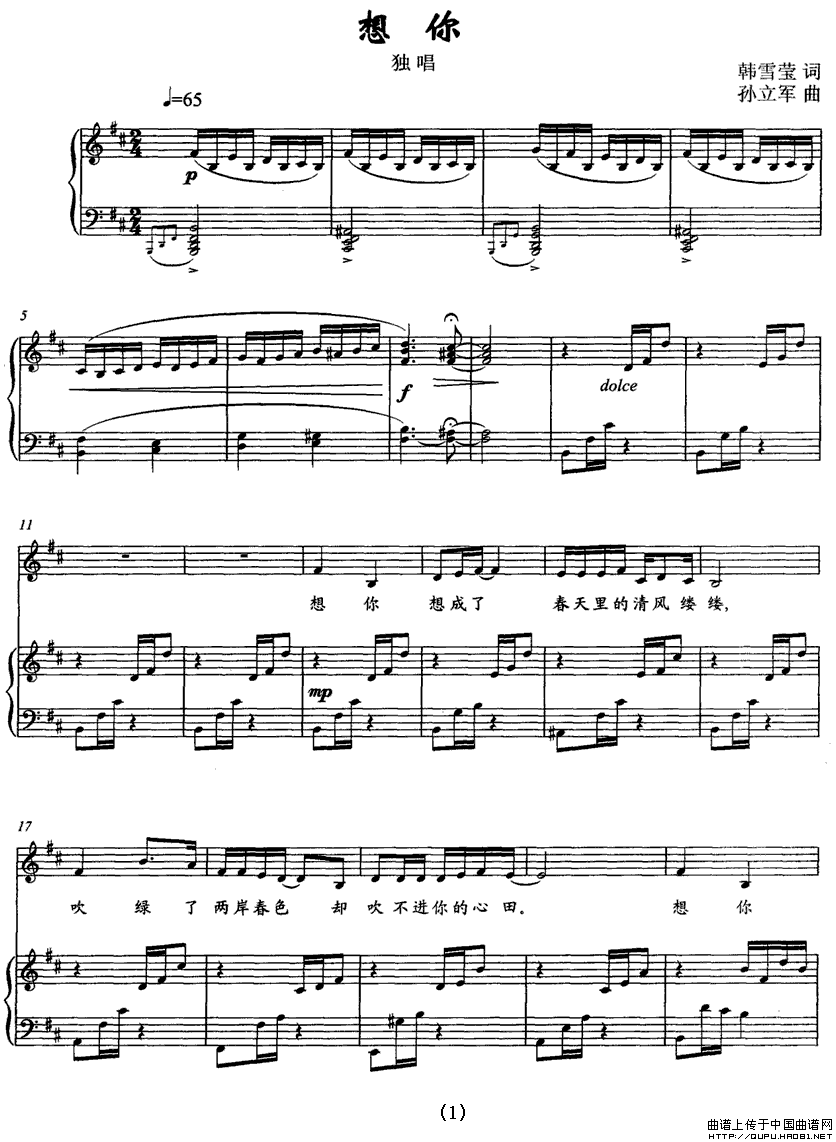 想你(韩雪莹词 孙立军曲、正谱)曲谱是由作词:韩雪莹作曲:孙立军格式:五线谱,上传:秋叶起舞,版权归原作者所有。