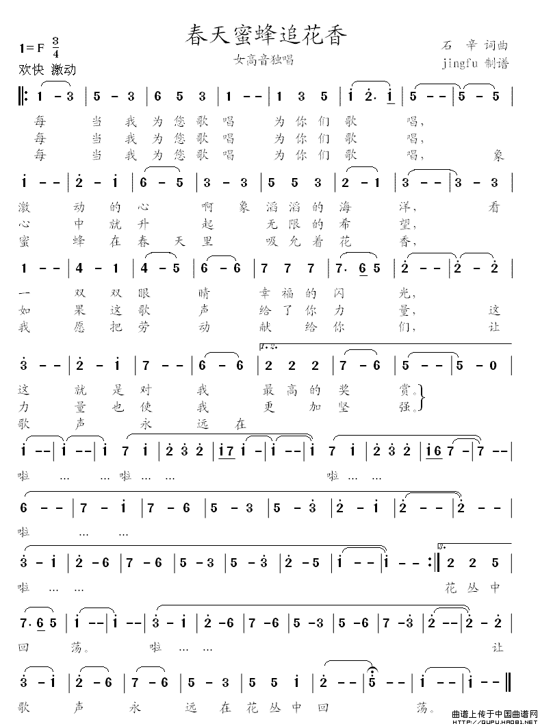 春天蜜蜂追花香曲谱是由作词:石辛作曲:石辛格式:简谱,上传:秋叶起舞,版权归原作者所有。