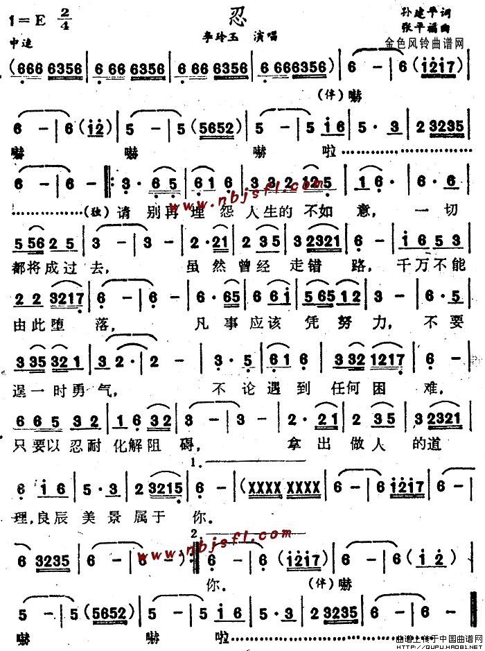 忍曲谱是由作词:孙建平作曲:张平福演唱(奏):李玲玉格式:简谱,上传:秋叶起舞,版权归原作者所有。
