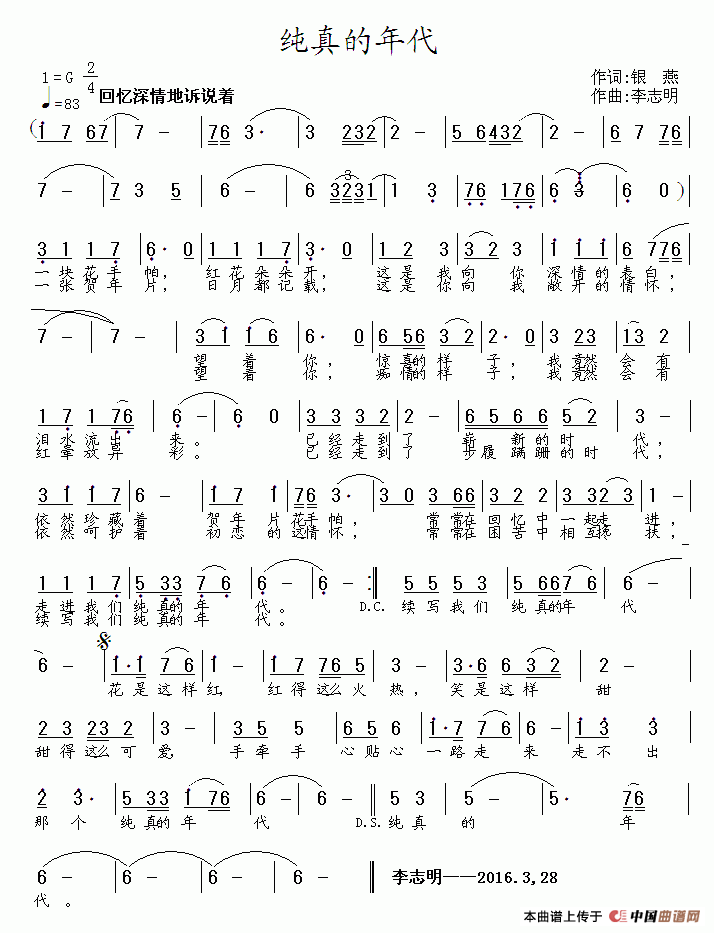 纯真的年代曲谱是由作词:银燕作曲:李志明,上传:车里子,版权归原作者所有。