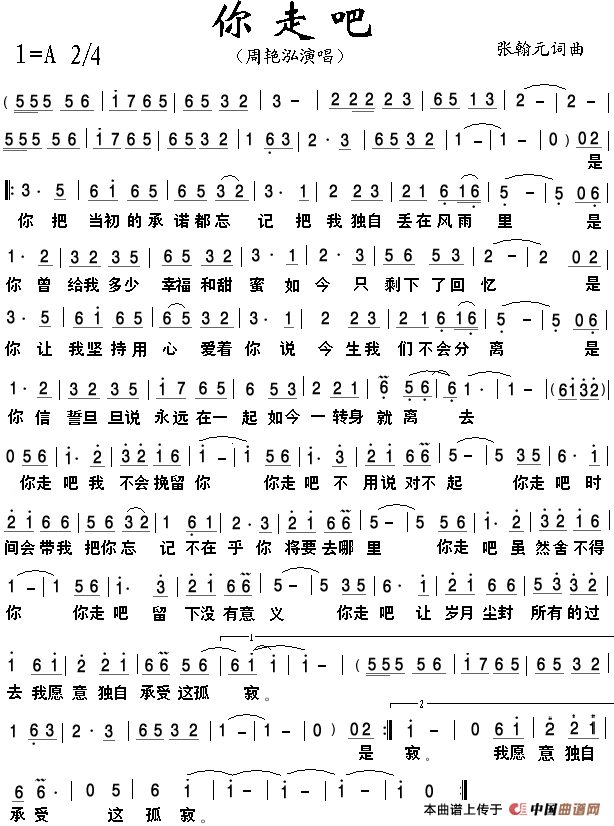 你走吧(张翰元 词曲)曲谱是由作词:张翰元作曲:张翰元演唱(奏):周艳泓,上传:孙sclwfy,版权归原作者所有。
