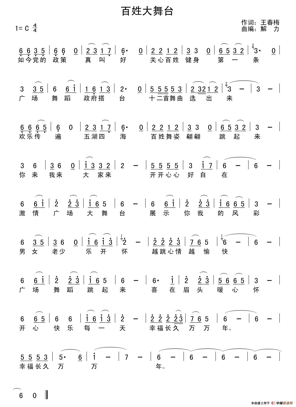 百姓大舞台 (王春梅词 解力曲)曲谱是由作词:王春梅作曲:解力,上传:秋叶起舞,版权归原作者所有。