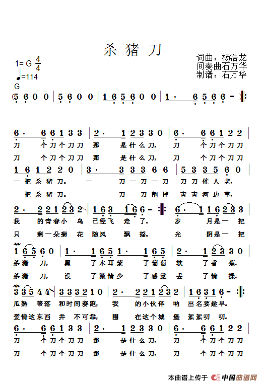 杀猪刀曲谱是由作词:杨浩龙作曲:杨浩龙,上传:石万华,版权归原作者所有。