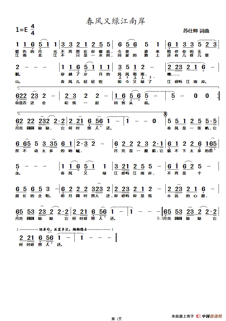 春风又绿江南岸(苏仕帅词曲)曲谱是由作词:苏仕帅作曲:苏仕帅演唱(奏):宾达梅,上传:乐在乐中,版权归原作者所有。