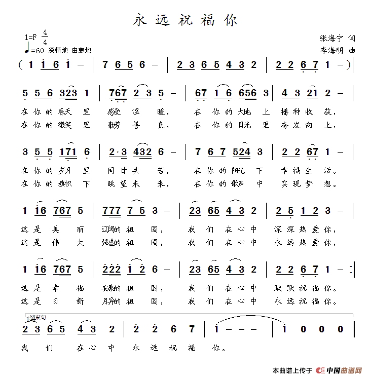 永远祝福你(张海宁词 李海明曲)曲谱是由作词:张海宁作曲:李海明,上传:李海明,版权归原作者所有。