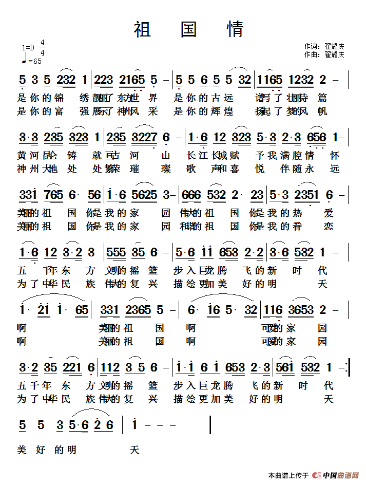 祖国情(翟耀庆 词曲)曲谱是由作词:翟耀庆作曲:翟耀庆演唱(奏):金姗姗,上传:zyqyy888,版权归原作者所有。