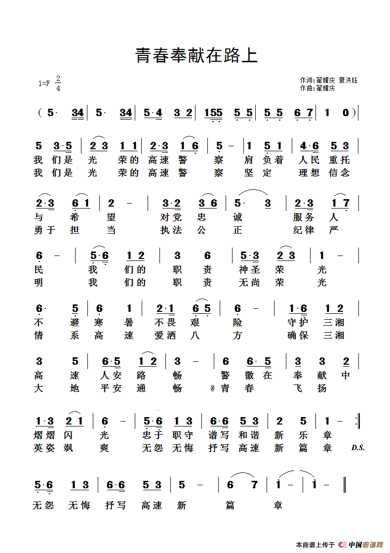 青春奉献在路上曲谱是由作词:翟耀庆夏洪钰作曲:翟耀庆,上传:zyqyy888,版权归原作者所有。