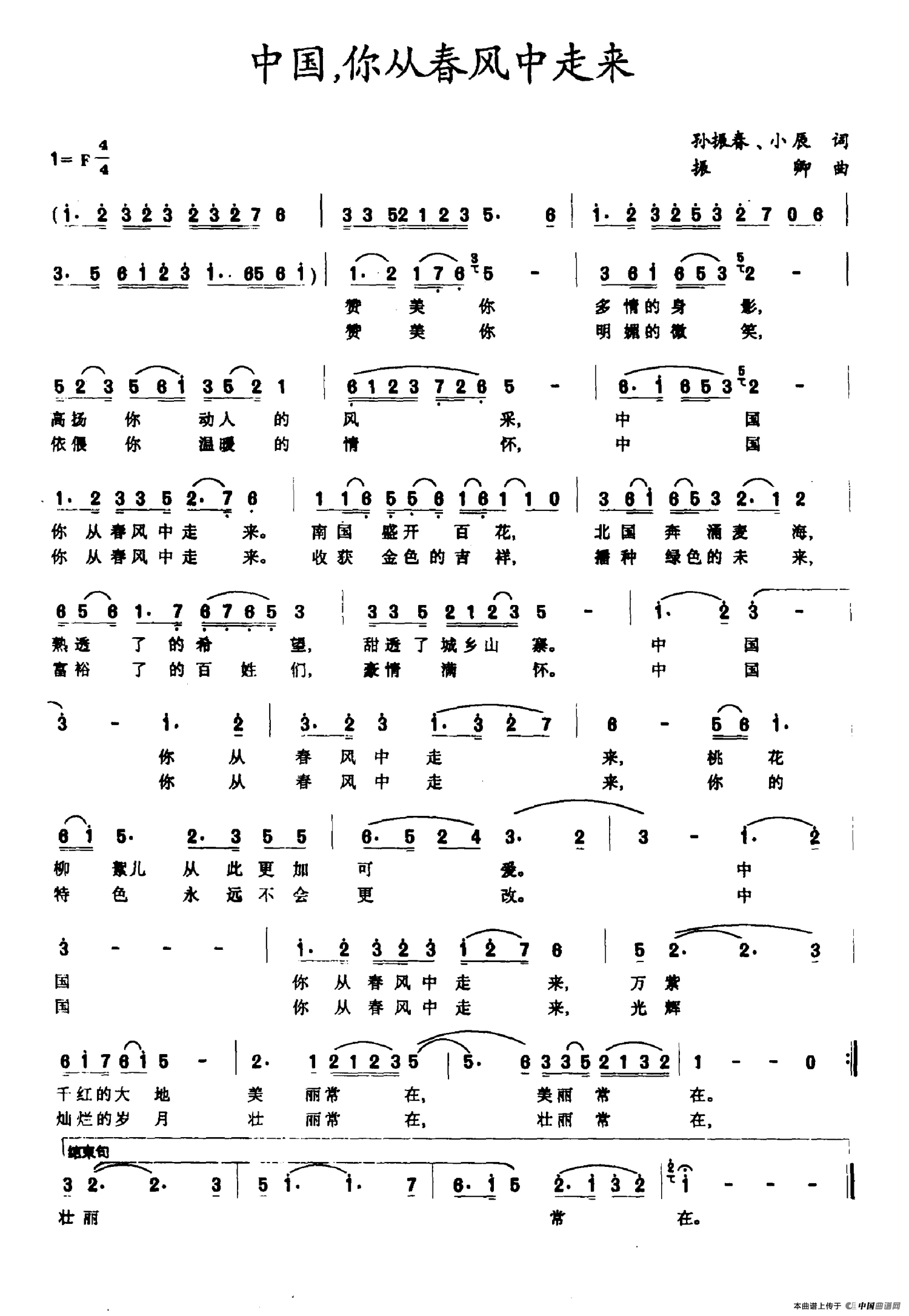 中国,你从春风中走来(孙振春 小辰词 振卿曲)曲谱是由作词:孙振春小辰作曲:振卿,上传:沉舟侧畔过,版权归原作者所有。