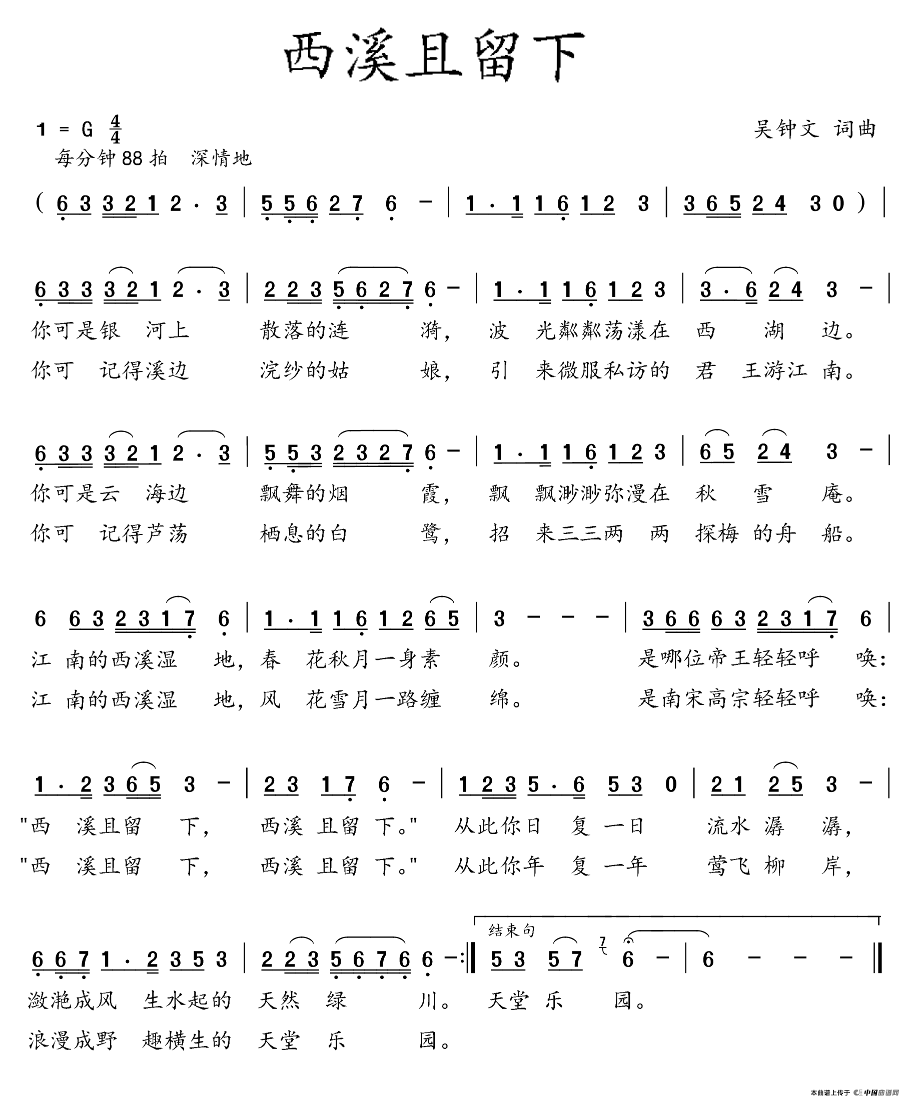 西溪且留下曲谱是由作词:吴钟文作曲:吴钟文,上传:吴钟文,版权归原作者所有。