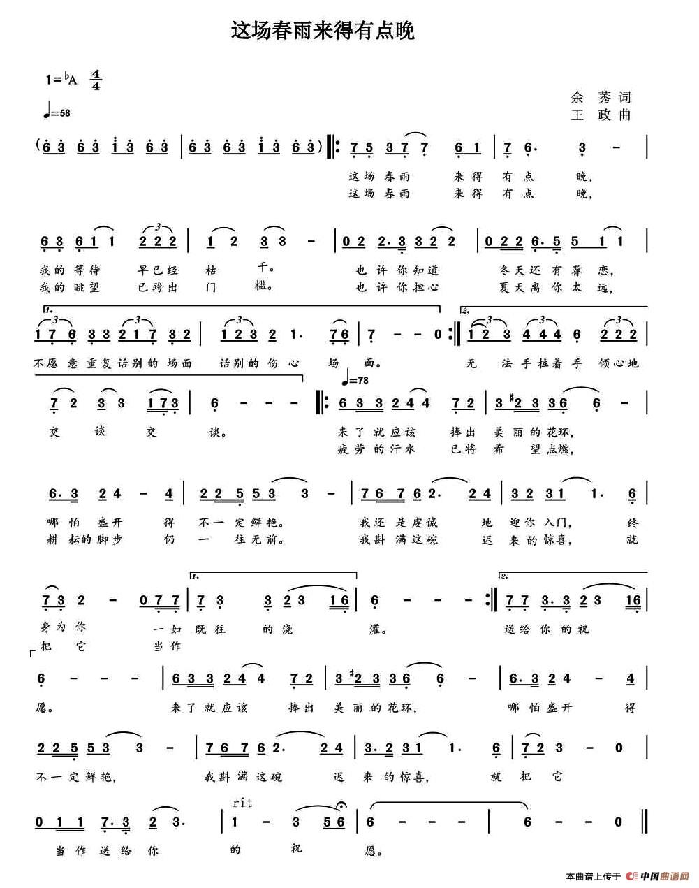 这场春雨来得有点晚曲谱是由作词:余莠作曲:王政,上传:车里子,版权归原作者所有。