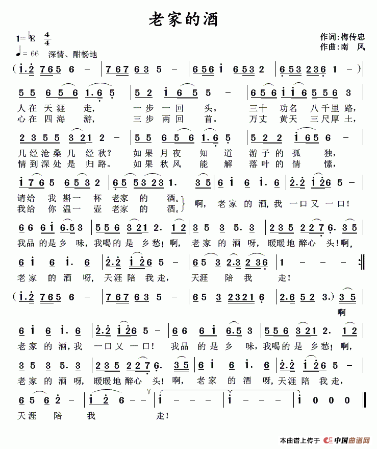 老家的酒(梅传忠词 南风曲)曲谱是由作词:梅传忠作曲:南风,上传:车里子,版权归原作者所有。