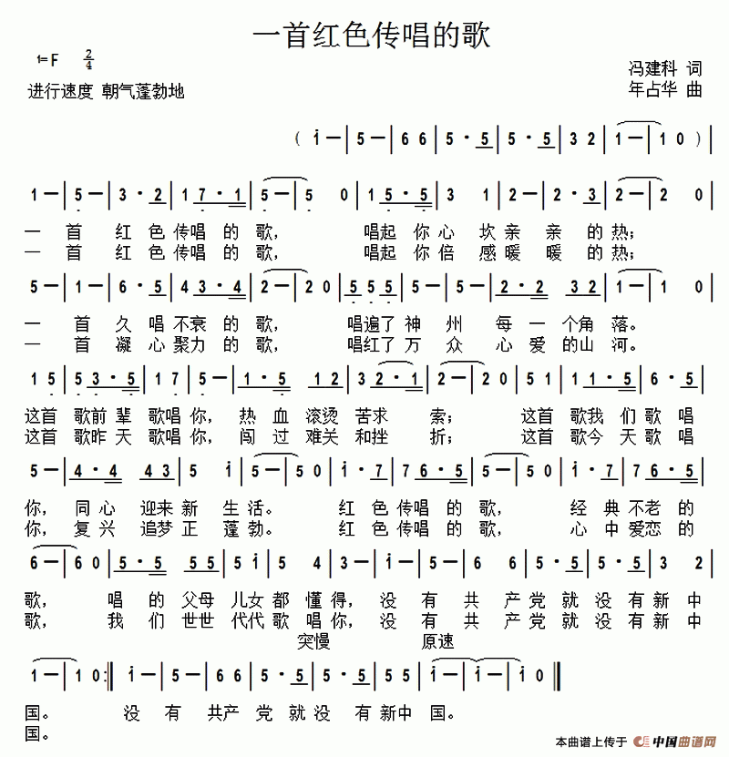一首红色传唱的歌 (冯建科词 年占华曲)曲谱是由作词:冯建科作曲:年占华,上传:车里子,版权归原作者所有。