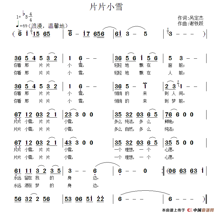 片片小雪曲谱是由作词:呙定杰作曲:谢铁跃,上传:谢铁跃,版权归原作者所有。