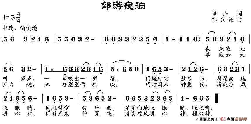 郊游夜泊曲谱是由作词:崔浩作曲:邹兴淮,上传:热爱音乐88,版权归原作者所有。