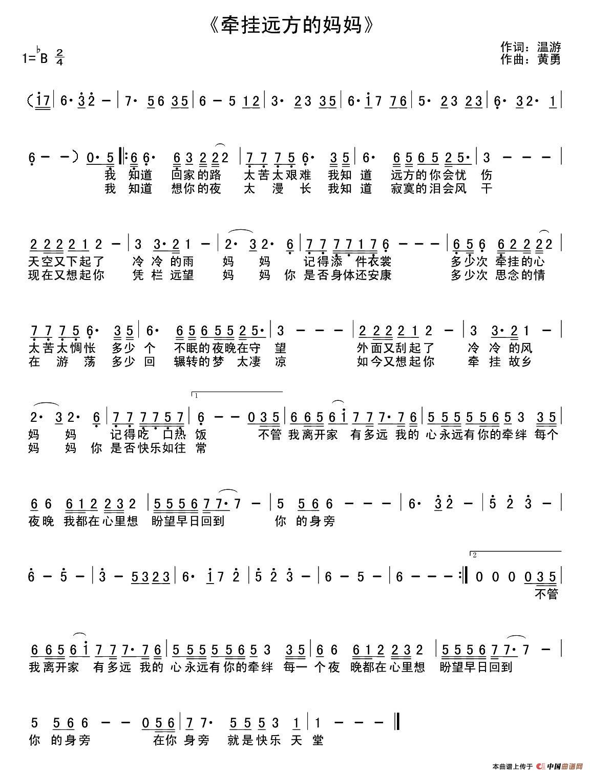 温馨提示:想要保存牵挂远方妈妈简谱,表达浓浓母爱情曲谱?在曲谱图片上单击右键,选择"图片另存为...",即可将该曲谱保存到您的电脑本地,想要打印出来?将图片插入到WORD中,调整合适到大小打印即可。