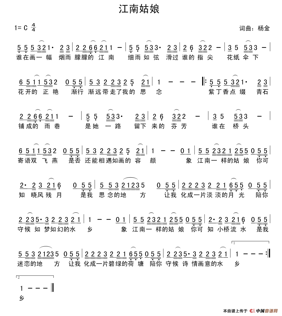 江南姑娘(杨金 词曲)曲谱是由作词:杨金作曲:杨金,上传:秋叶起舞,版权归原作者所有。