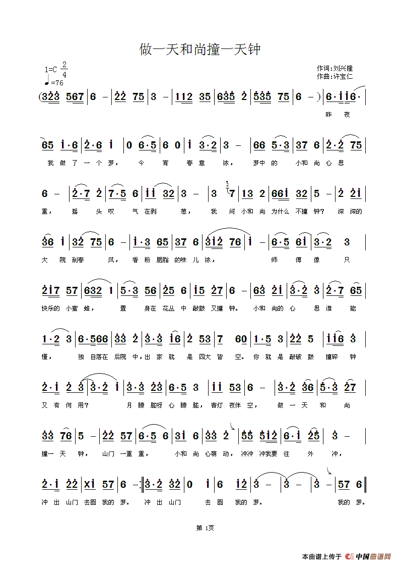 做一天和尚撞一天钟曲谱是由作词:刘兴隆作曲:许宝仁,上传:许宝仁,版权归原作者所有。