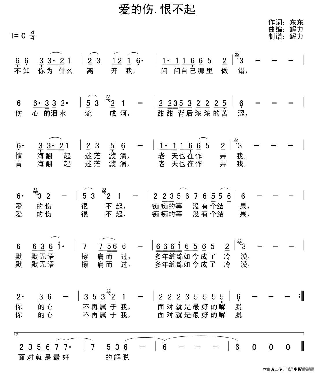 爱的伤,恨不起曲谱是由作词:东东作曲:解力,上传:秋叶起舞,版权归原作者所有。
