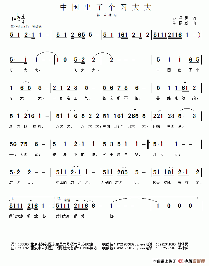 中国出了个习大大曲谱是由作词:胡泽民作曲:岑棣威,上传:车里子,版权归原作者所有。