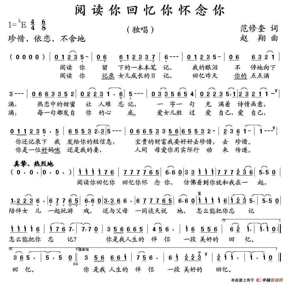 阅读你回忆你怀念你曲谱是由作词:范修奎作曲:赵翔,上传:新人上线,版权归原作者所有。