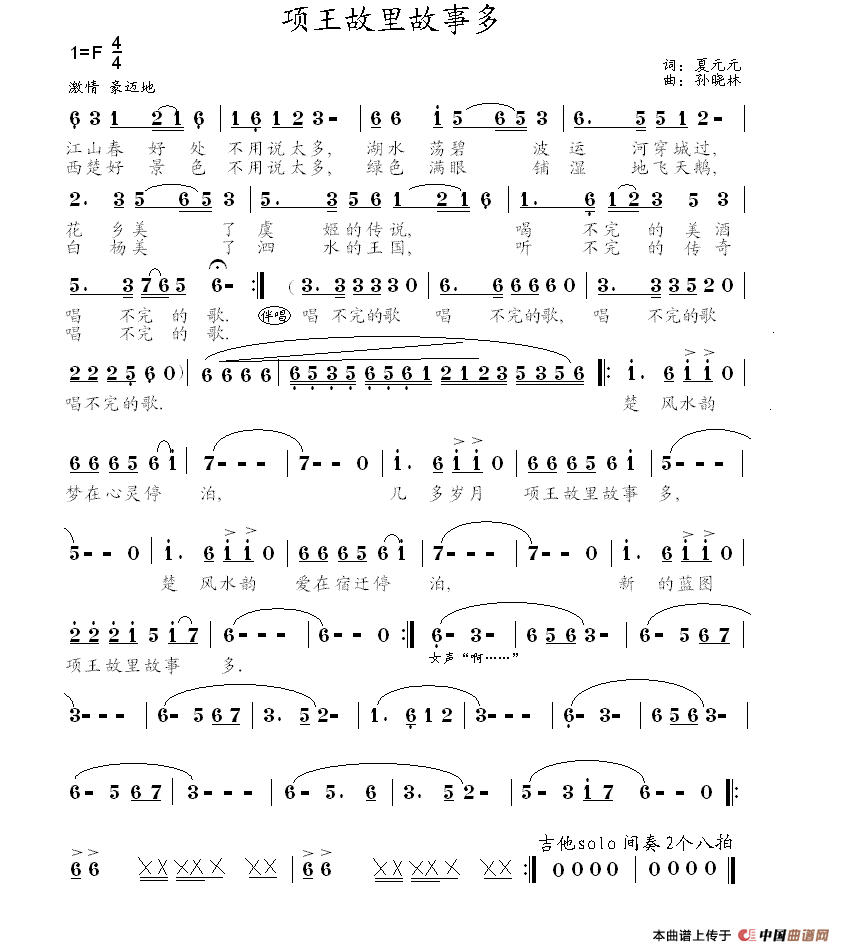 项王故里故事多(夏元元词 孙晓林曲)曲谱是由作词:夏元元作曲:孙晓林演唱(奏):谢桐,上传:作编曲小林,版权归原作者所有。