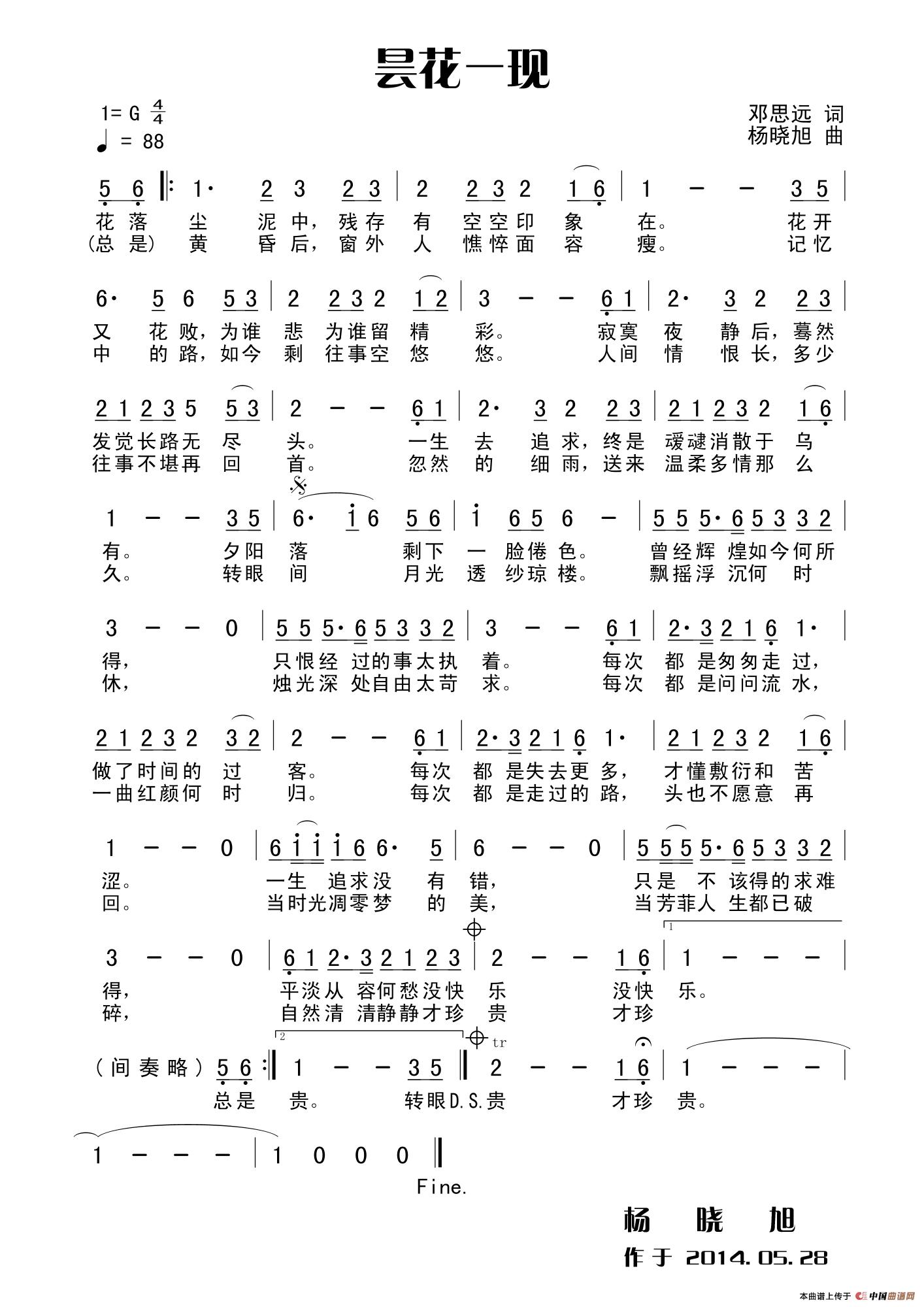 昙花一现(田宇词 杨晓旭曲)曲谱是由作词:田宇作曲:杨晓旭,上传:田宇,版权归原作者所有。