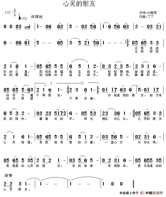 心灵的朋友曲谱是由作词:刘美军作曲:丁丁,上传:秋叶起舞,版权归原作者所有。