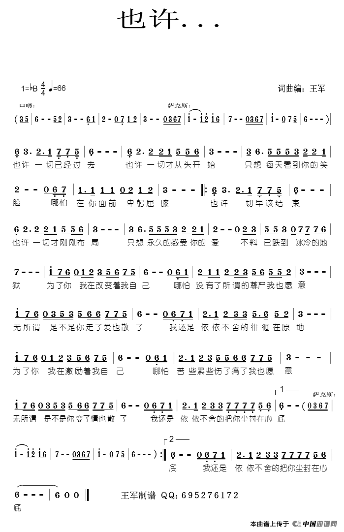 也许(王军词曲)曲谱是由作词:王军作曲:王军,上传:车里子,版权归原作者所有。