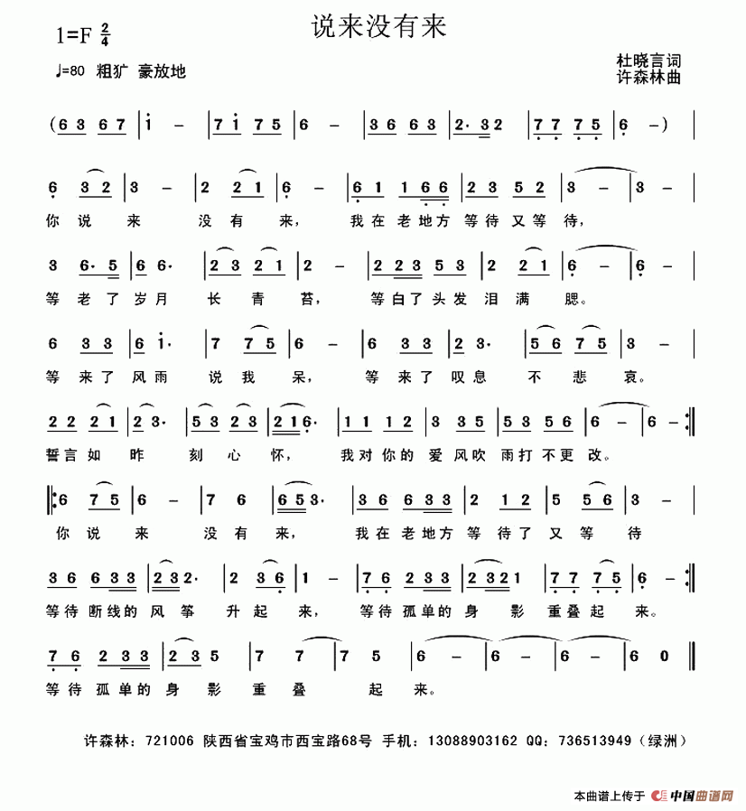 说来没有来曲谱是由作词:杜晓言作曲:许森林,上传:车里子,版权归原作者所有。