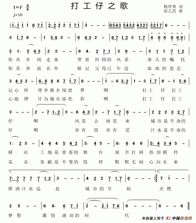 打工仔之歌(杨厚爽词 居之浩曲)曲谱是由作词:杨厚爽作曲:居之浩,上传:秋叶起舞,版权归原作者所有。