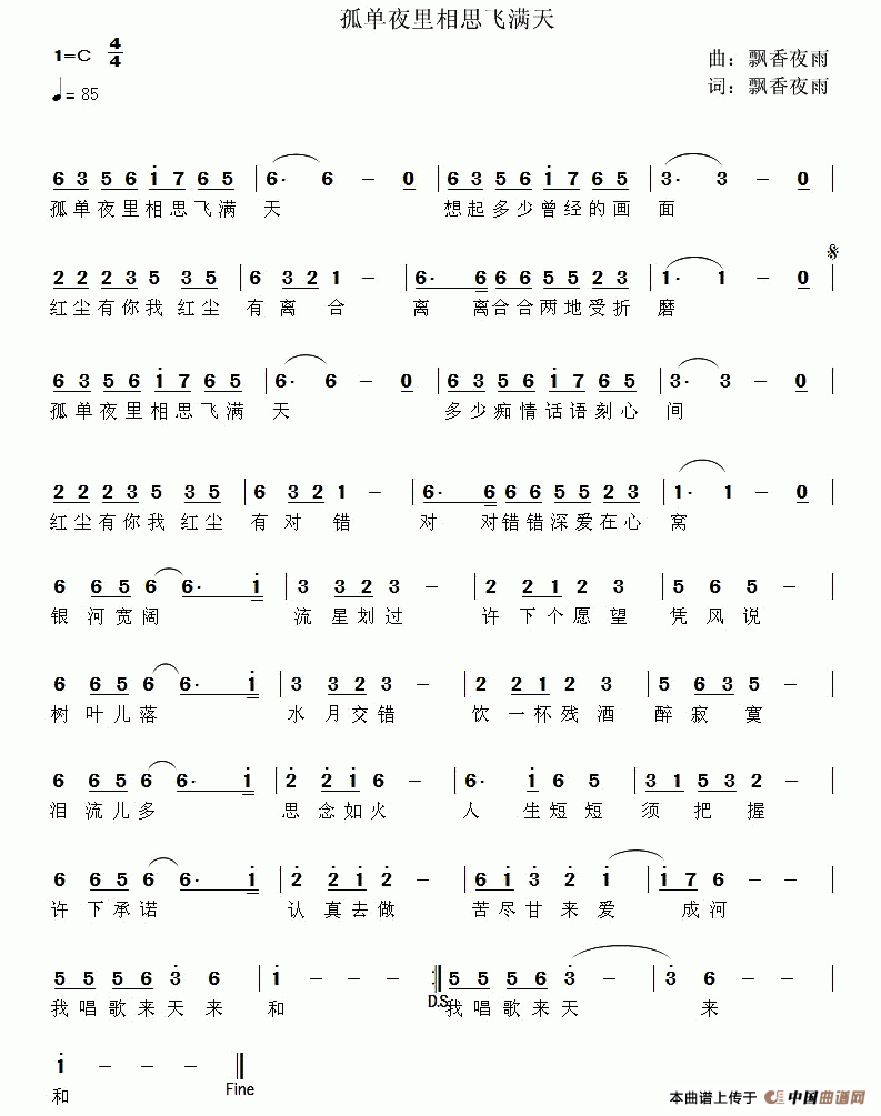 孤单夜里相思飞满天曲谱是由作词:飘香夜雨作曲:飘香夜雨,上传:车里子,版权归原作者所有。