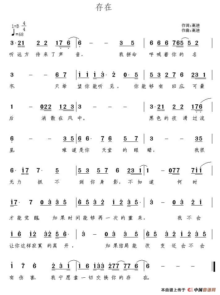 存在(高进 词曲)曲谱是由作词:高进作曲:高进演唱(奏):高进,上传:车里子,版权归原作者所有。