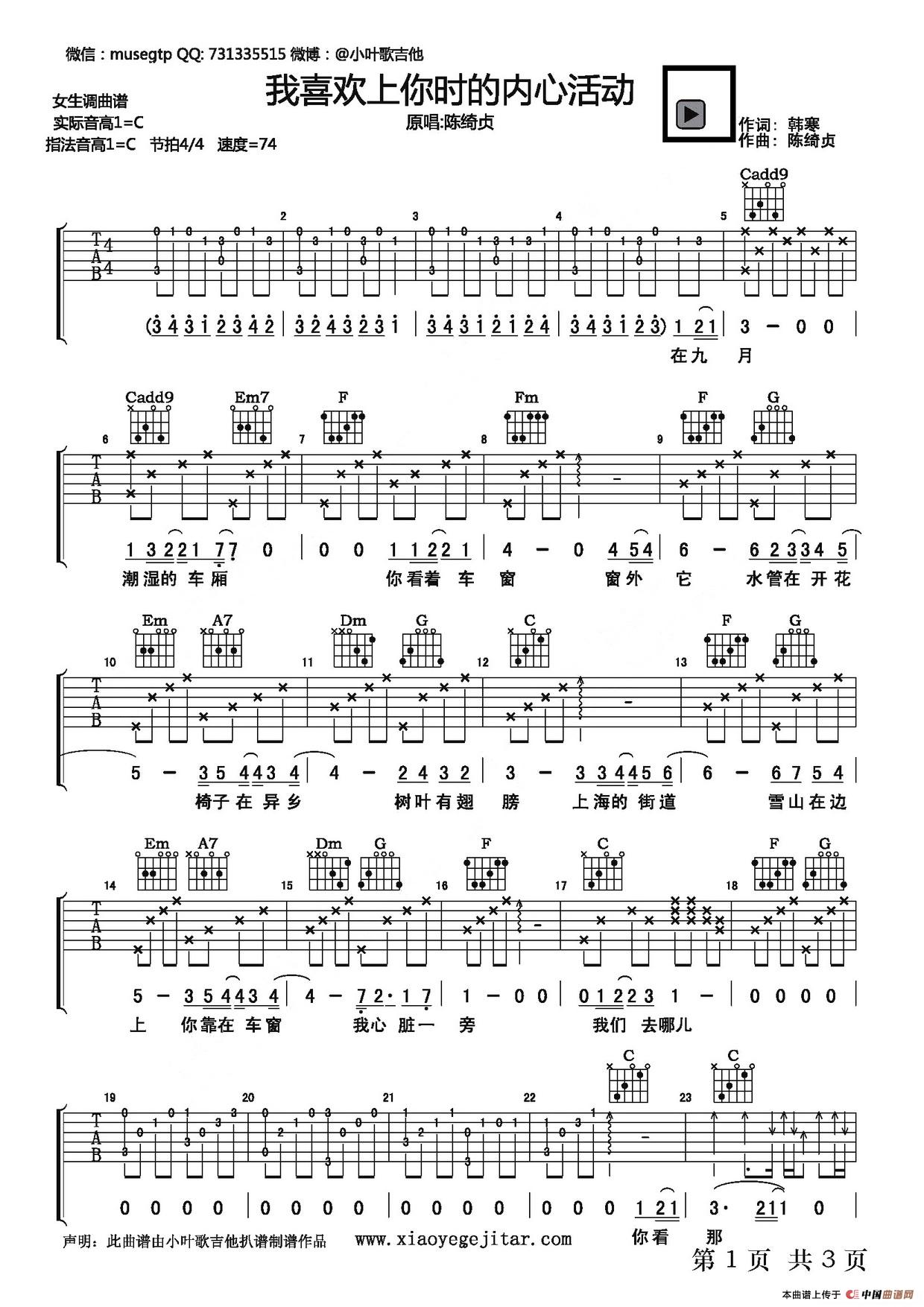 温馨提示:想要保存我喜欢上你时的内心活动(小叶吉它版)吉他谱六线谱,诉说心动之感曲谱?在曲谱图片上单击右键,选择"图片另存为...",即可将该曲谱保存到您的电脑本地,想要打印出来?将图片插入到WORD中,调整合适到大小打印即可。