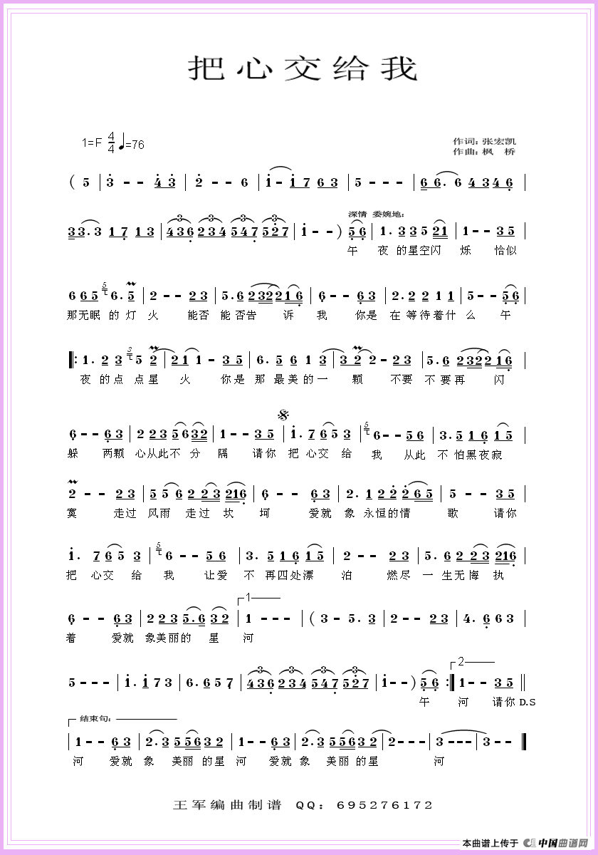 把心交给我曲谱是由作词:张宏凯作曲:枫桥,上传:秋叶起舞,版权归原作者所有。
