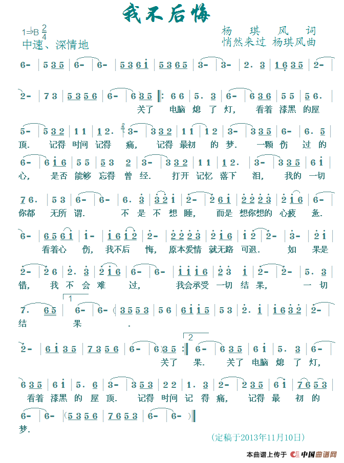 我不后悔(杨琪风词 悄然来过 杨琪风曲)曲谱是由作词:杨琪风作曲:悄然来过杨琪风,上传:秋叶起舞,版权归原作者所有。