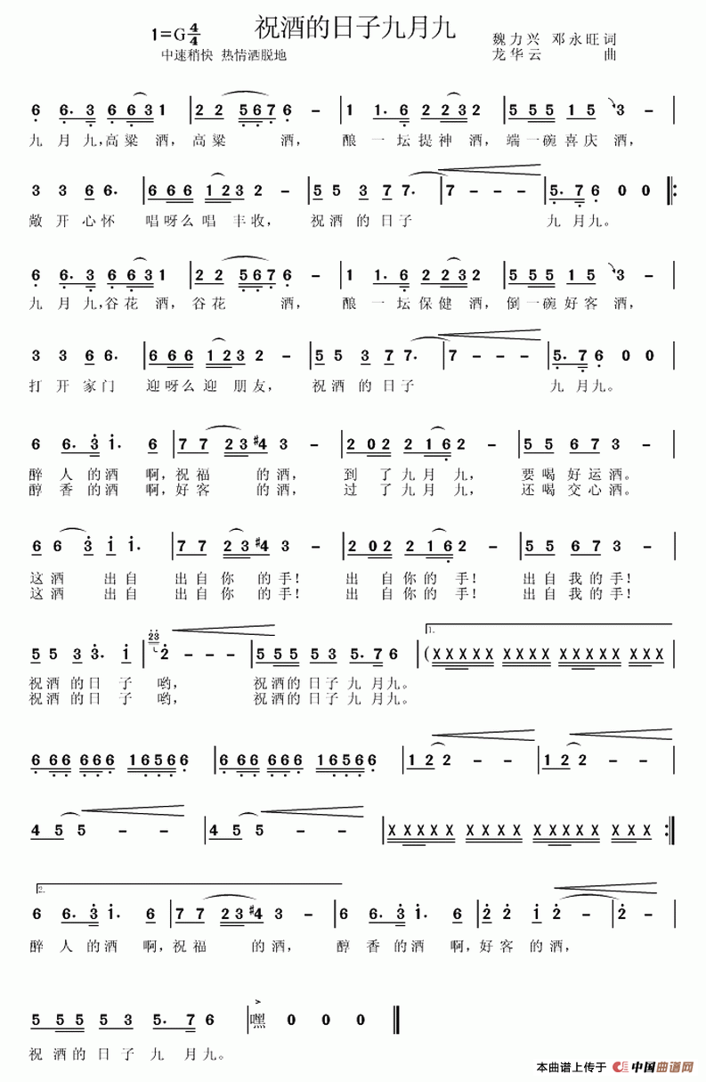 祝酒的日子九月九曲谱是由作词:邓永旺作曲:龙华云,上传:秋叶起舞,版权归原作者所有。
