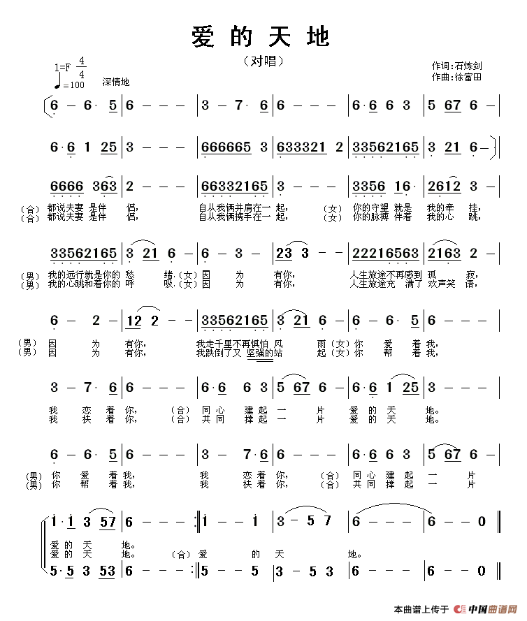 爱的天地曲谱是由作词:石炼剑作曲:徐富田,上传:秋叶起舞,版权归原作者所有。