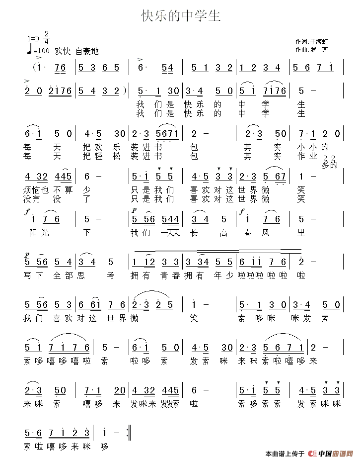 快乐的中学生曲谱是由作词:于海虹作曲:罗齐,上传:秋叶起舞,版权归原作者所有。
