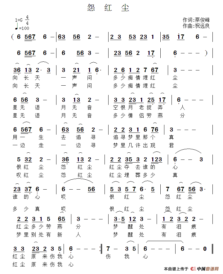 怨红尘(蔡俊峰词 祝远良曲)曲谱是由作词:蔡俊峰作曲:祝远良,上传:秋叶起舞,版权归原作者所有。